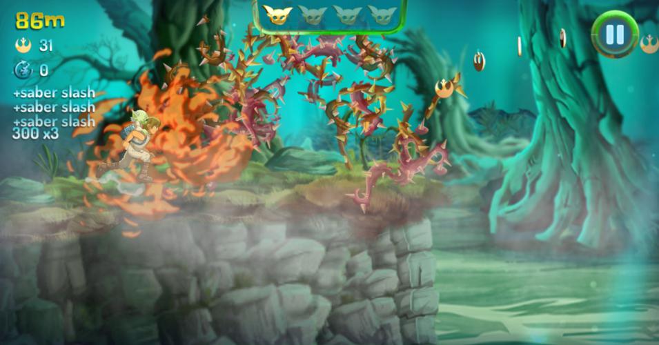 游戏中,玩家不仅要利用手中的光剑去斩断挡在前方的各类怪物,灵活的操作也是获得更高分数的必要条件;另一方面,《跑酷特训》中天气与场景是随时变化的,比较考验玩家的随机应变能力,值得一提的是,当收集到四个尤达金币后,会随机传送到环境世界中,金币奖励很可观。