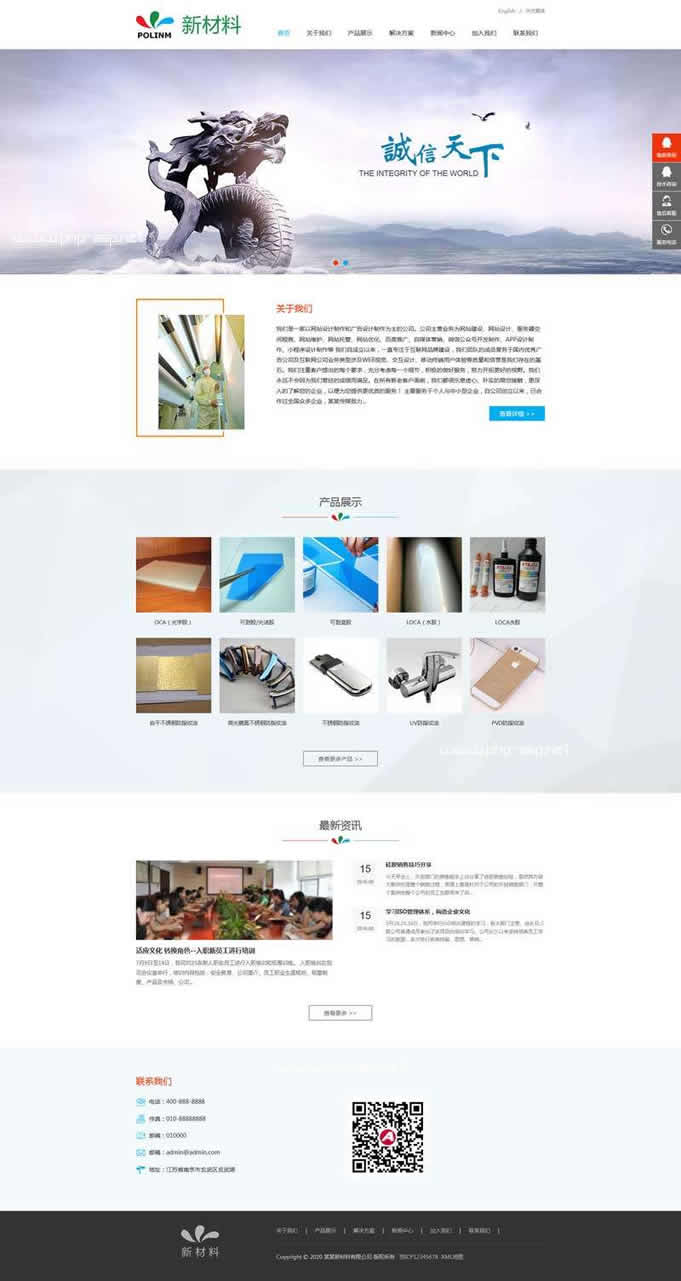 一款蓝色大气的新材料,环保材料,手机贴膜材料销售公司网站响应式织梦模板dedecms下载。包含: 关于我们、公司简介、解决方案、新闻中心、加入我们、联系我们等模块页面。